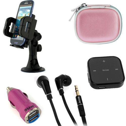 Description: iKross IKBT19 Bluetooth Music Audio Receiver with Stereo Handsfree HeadsetListen to music or talk wirelessly from iPhone or bluetooth enabled cellphone with stereo handsfree earbud headset.Connect iKross Bluetooth Receiver to car speaker or PC speaker with audio cable and play music wirelessly from iphone or bluetooth enabled cellphone.Built-in rechargeable battery could last up to 4.5 hours.Transmits up to 33 feet away.Answer, end and reject phone call.Volume adjustment & mute features.Play, Pause, Previous & Next track.Echo cancellation and noise suppression.Advanced built-in microphone.Bluetooth Headset Carrying Pouch Case - PinkBrand new generic case.Stylish & high quality foam case.Smooth, non-scratch lining interior.Prevents damage or scratch to your bluetooth headset from objects in your pockets or purse.Bluetooth headset not included.Able to fit object size: 2in (L) x 2.5in (W) x 1.0in (H).2-Port USB Car Charger Vehicle Power Adapter - Hot Pink (2000mA)Brand new GTMax charger.Color:Hot Pink.Input: 12v DC.Output: 5.0V / 2000mA.Short circuit protection.LED charging indication.2 USB Port.Plug never heats or overcharges the battery.Intelligent IC chip inside recognizes a full battery and automatically switch to a saver.iKross IKHD15 Universal Car Windshield Mount Holder for iPhone CellphoneEasily attach & secure suction cup on windshield without tools.Adjust flexible arm in multiple angles for easy viewing.Extra-firm arm absorbs vibration and provide stable viewing platform.Suitable for all vehicles windshield.Fit the devices width from 1.46 to 4.49 inches (37 to 114mm).Package include: phone holder & windshield mount.Feature: Brand new iKross Bluetooth 3.0 Stereo Receiver/Handsfree Headset